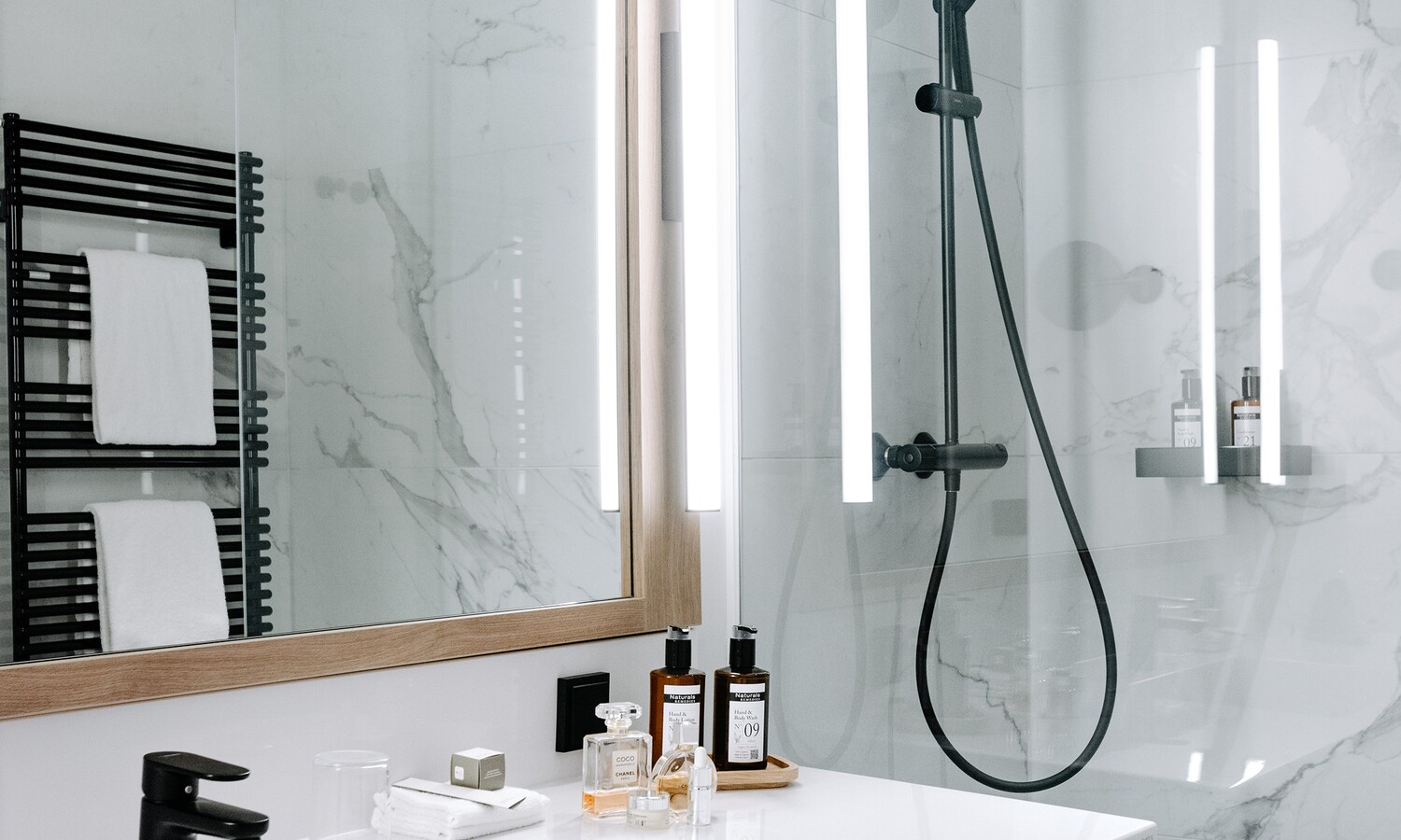 Ausgewählte Möbel in neutralen Beige- und Grüntönen, hochwertiger Parkettboden und ein reduziertes Design prägen die ruhige, lichtdurchflutete Atmosphäre. Das Badezimmer ist mit einer ebenerdigen Regendusche ausgestattet, die meisten Zimmer verfügen zudem über ein separates WC. Individuell dimmbare Beleuchtung unterstreicht den klaren, zeitlosen Charakter.