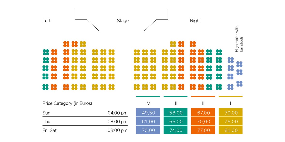 You can pick up your reserved tickets at any time during the regular opening times of the "Stars in Concert" ticket counter, but no later than 30 minutes before the show begins on the day of the performance.